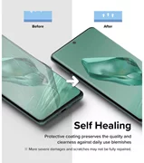 Kristallklare Ringke Dual Easy Schutzfolie, die die gesamte Bildschirmoberfläche bedeckt. Sie besteht aus hochwertigem Urethan-Polycarbonat und hat eine Kratzfestigkeit von 3H, die den Bildschirm effektiv vor Beschädigungen schützt. Die Folie gibt die angezeigten Farben perfekt wieder und verfügt über eine spezielle Anti-Fingerprint-Beschichtung, die das Display vor Fingerabdrücken schützt.