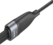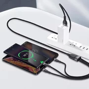 Dieses einzigartige Kabel von Baseus bietet eine Menge Möglichkeiten. Es hat drei verschiedene Anschlüsse: Mikro, Lightning und Typ C. Alle eignen sich zum schnellen Laden verschiedener Telefone. Das Ganze spart viel Zeit und Platz auf Ihrem Schreibtisch, im Gegensatz zu drei separaten Kabeln. Es ist überraschend einfach zu lagern, aber dank seiner Portabilität ist es auch kein Problem beim Transport. Der mitgelieferte stylische Klettverschluss erleichtert das Aufrollen und sorgt für Ordnung
