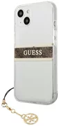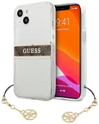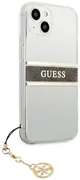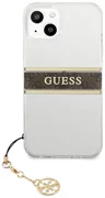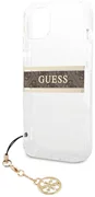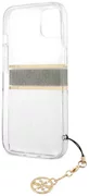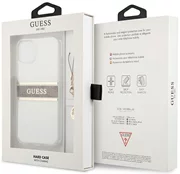 Ratetui mit klassischem Charakter - transparentes klassisches Gehäuse mit goldenen Streifen und Guess-Logo auf dem Druck mit Saffiano-4G-Material.