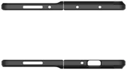 Die leicht erhabene Form des Gehäuses um die Kamera und den Bildschirm schützt es vor Kratzern, indem das Telefon knapp über der ebenen Oberfläche schwebt. Es hat Tastenabdeckungen und Ausschnitte für Anschlüsse.