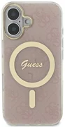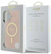 Das Etui besticht durch außergewöhnliche Eleganz, die durch raffinierte Details wie den goldenen Rahmen um die Kamera und den stilvollen goldenen MagSafe-Ring gekennzeichnet ist. Der hochwertige 4G-Druck, eine Ikone des Guess-Stils, verleiht der Tasche einen klassischen, zeitlosen Look. Das Guess-Logo ist dezent in den Magnetring integriert und passt perfekt zum Farbschema der Tasche, so dass ein harmonisches und stimmiges Gesamtbild entsteht.