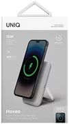 UNIQ Hoveo - eine magnetische, kabellose Powerbank mit bis zu 20 W USB-C-Eingang, die schnelles PD-Laden unterstützt. Die Powerbank verfügt über einen ausziehbaren Aluminiumständer, mit dem Sie Ihr Telefon aufladen und Filme freihändig ansehen können.